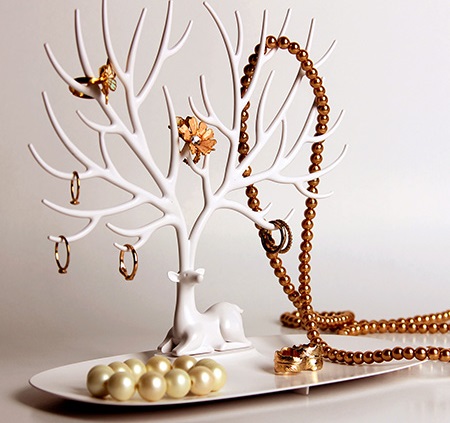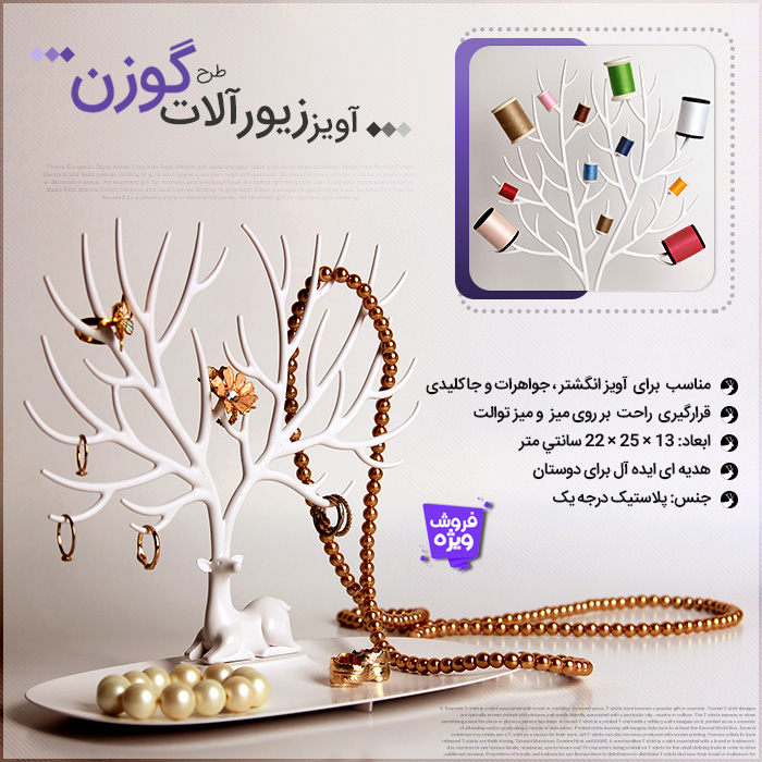 آویز زیور آلات طرح گوزن یک وسیله بسیار کاربردی برای آویز کردن جواهرات یا دیگر لوازم است که علاوه بر کاربردش به عنوان وسایل دکوراتیو منزل نیز می توانید از آن استفاده نمایید. شاخ های طراحی شده برای این گوزن به شکل درخت و زیاد هستند تا بتوانید با خیال راحت تمامی جواهرات خود را یا به شاخه ها آویزان کنید و یا درون سینی پایه آن قرار دهید. جنس این محصول از پلاستیک درجه یک و با کیفیت می باشد بنابراین نگرانی بابت افتادن یا شکستن آن نخواهید داشت. آویز جواهرات گوزن تنها برای خانم ها نبوده و آقایان نیز می توانند برای نگهداری ساعت، انگشتر، کیف پول، کلید و ... از این محصول استفاده نمایند.