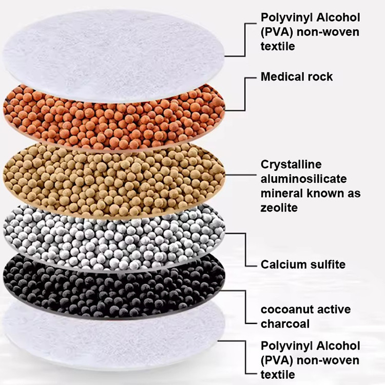 - ساختار 6 لایه شامل PVA غیر بافت، زئولیت، سنگ مایفان، سولفیت کلسیم، کربن فعال پوسته نارگیل، پارچه غیر بافته PVA